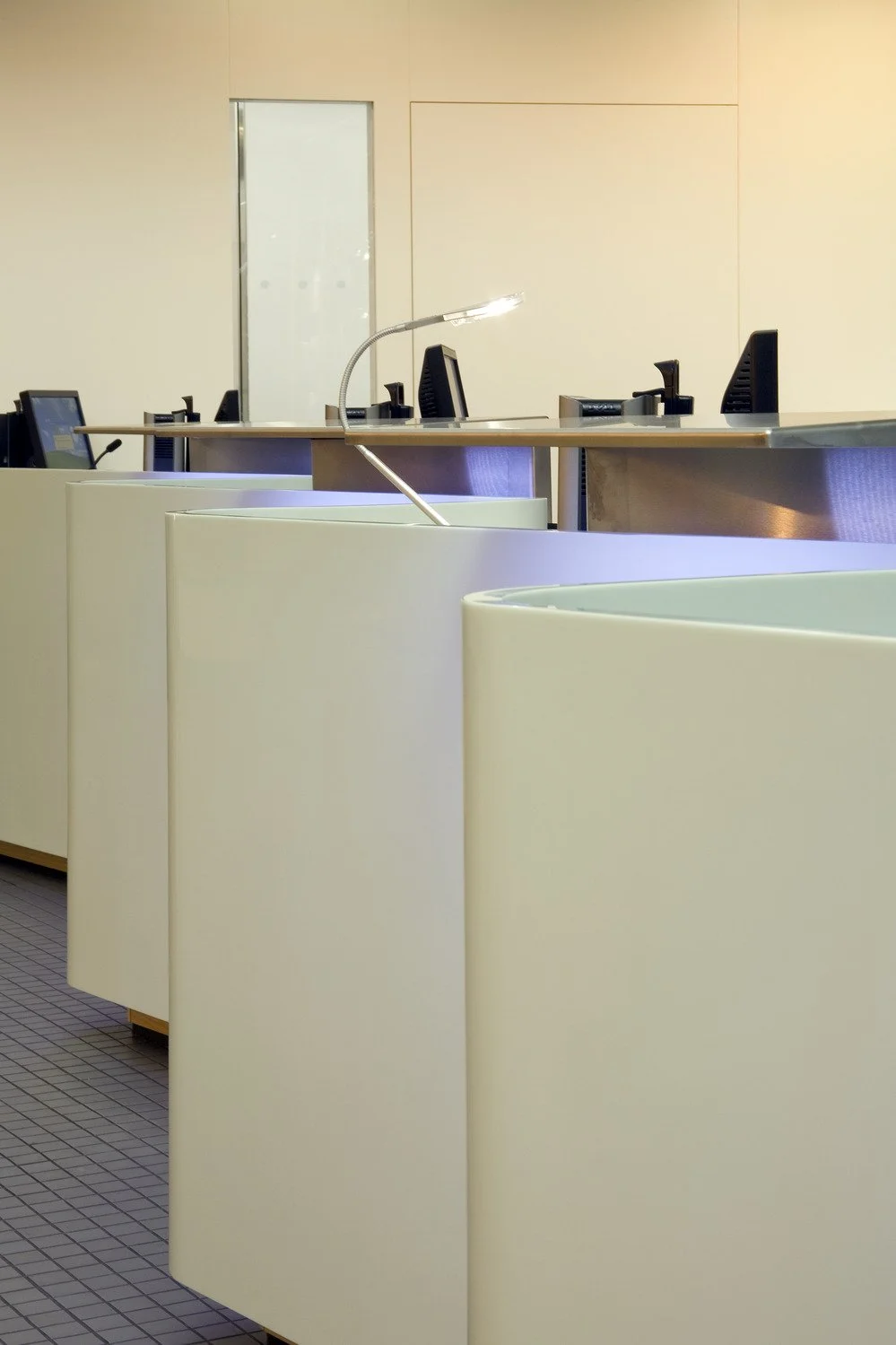 A robust corium finish was employed for the desk front, with integral task lighting. This was conceived as a sculptural installation, to pick up reflected light from the pool opposite.