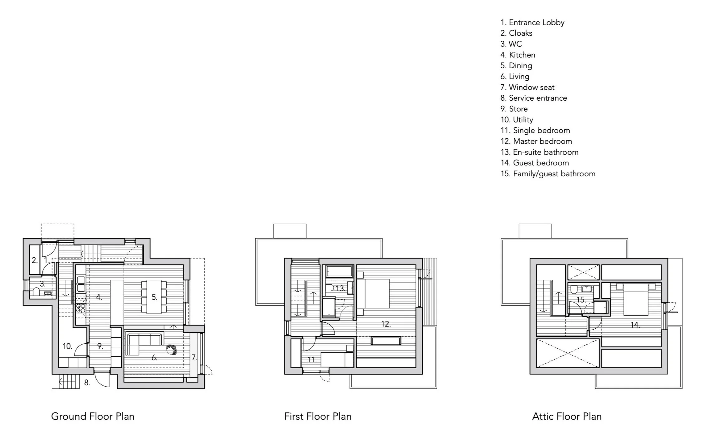 A sequence of living spaces step down the slope to the garden, with the stair making use of the half landing for the second bedroom. The master bedroom on the first floor faces the garden, with a guest room occupying the loft triangle above.