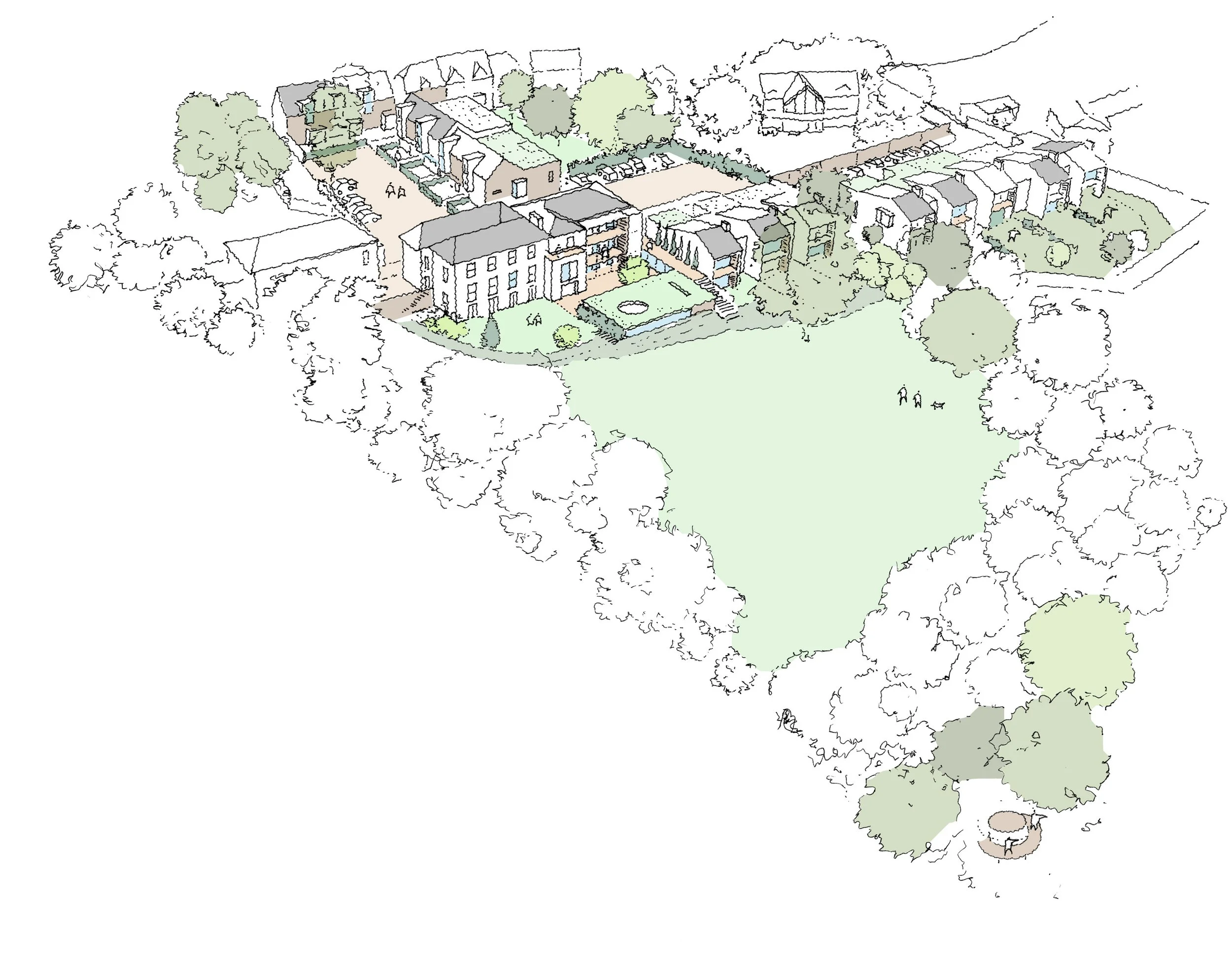 A cluster of 8 apartments, backing onto a walled garden, stepped down the slope and into the woodland spaces to the front of the original house.