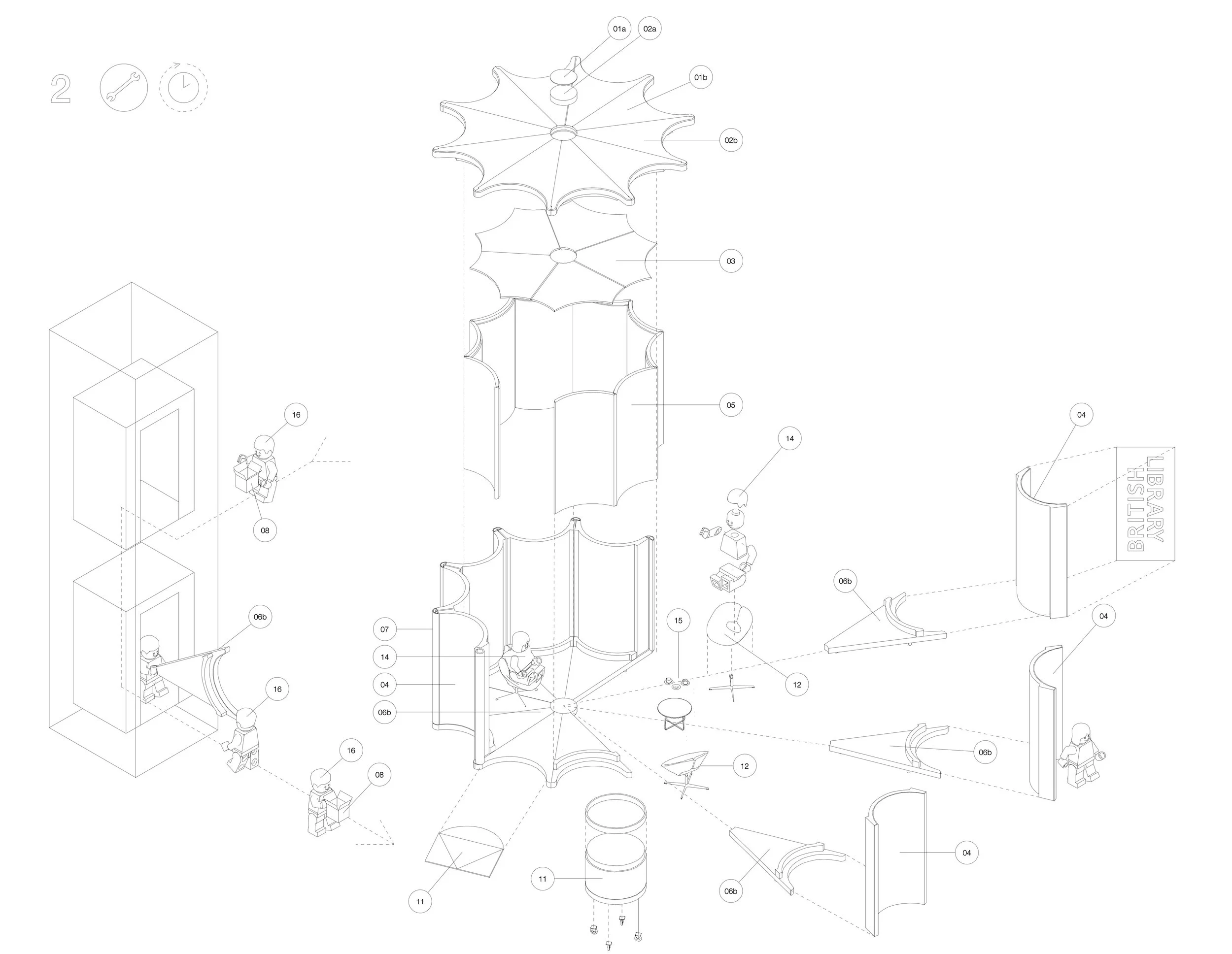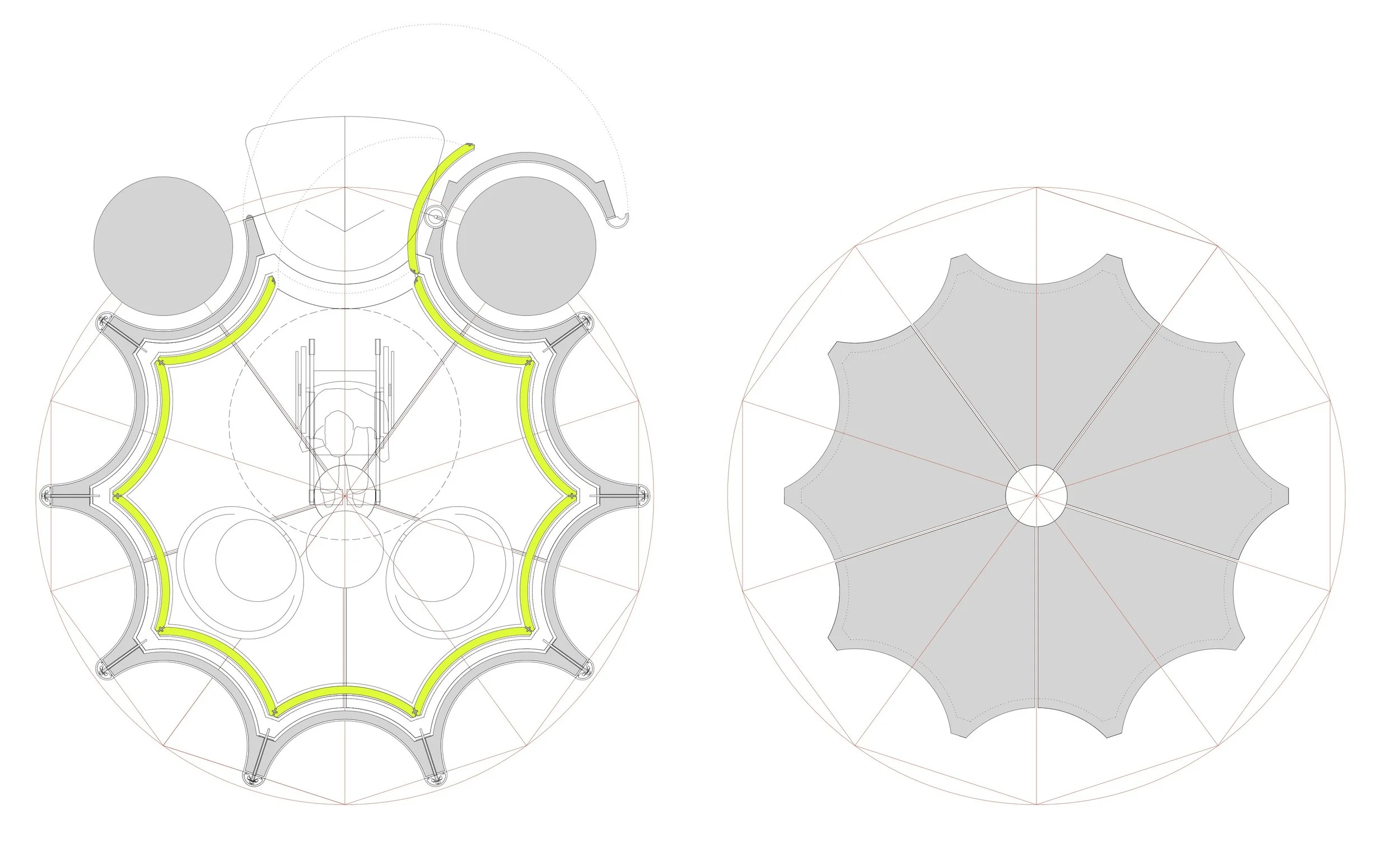 Working with an acoustician, this design sought to create an integral soundproof space, using the form and geometry of a radial structure. This allows wide compressible joints to be “pulled in” and clamped into position to create an airtight interior.